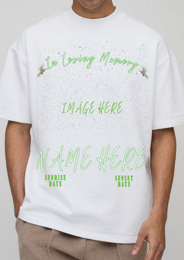 Showcase your unique memorial Tee, complete with your own photos. Easily create your one-of-a-kind design by simply choosing a shirt and size, adding text and choosing the perfect color combination for your text and background. Upload 3-6 high-quality, well-lit photos to ensure a polished finish. With this effortless process, your custom t-shirt will be a standout in any crowd.